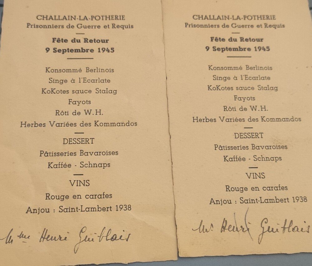 Henri Guiblais reviendra en France et se mariera le 22 mai 1943. Lui va travailler chez Delhommeau, une entreprise de transports à Candé. Son épouse tiendra un café à la Grée Saint-Jacques jusqu'en 1965. De ce café reste toujours la licence 4 de débit de boissons au profit du club de foot local nouvellement créé avec la fusion des deux clubs candéens l'US et le Réveil, qui ont racheté cette licence. Sa fille, Nicole Ploteau, indique que son papa n'a jamais parlé de la guerre. Elle conserve ses documents de captivité : dessins, cartes postales, fascicules. Parmi eux, le menu cocasse du banquet du 9 septembre 1945 à Challain-la-Potherie, célébrant le retour des prisonniers de guerre, avec des plats aux noms ironiques comme Singe à l'écarlate, Kokotes sauce Stalag ou encore Rôti de W.H., Herbes variées de Kommandos, patisseries Bavaroises, Kaffée, Schnaps, ... et du rouge en carafe de Saint Lambert, cru 1938.