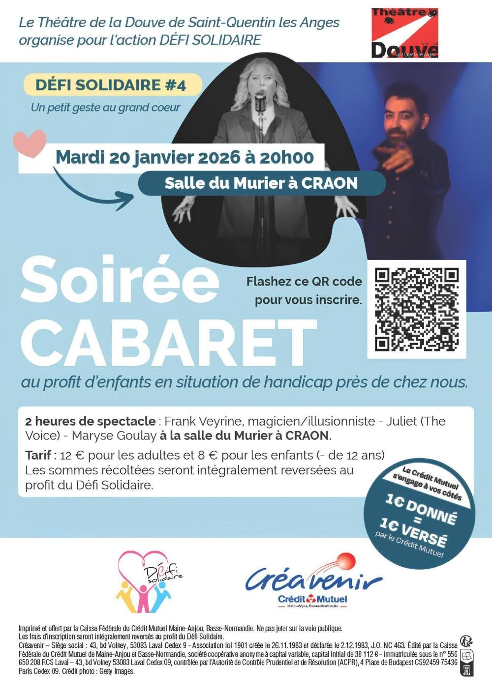 Une soirée cabaret solidaire se déroulera mardi 20 janvier 2026, à la salle du Mûrier à Craon (Mayenne), pour soutenir les enfants en situation de handicap. "Cette soirée exceptionnelle, placée sous le signe du partage et de la convivialité, réunira des artistes reconnus du territoire", prévient Hervé Maugeais, président de la caisse locale Créavenir. Entre autres seront présents Franck Veyrine, magicien et illusionniste, maître de cérémonie du cabaret Le Live à Château-Gontier (Mayenne), Juliet, chanteuse révélée par The Voice, Maryse Goulay, chanteuse du Théâtre de la Douve. Pendant près de deux heures de spectacle, "le public est invité à vivre un moment festif et intergénérationnel, tout en soutenant une cause essentielle". L'intégralité des bénéfices sera reversée au Défi solidaire.